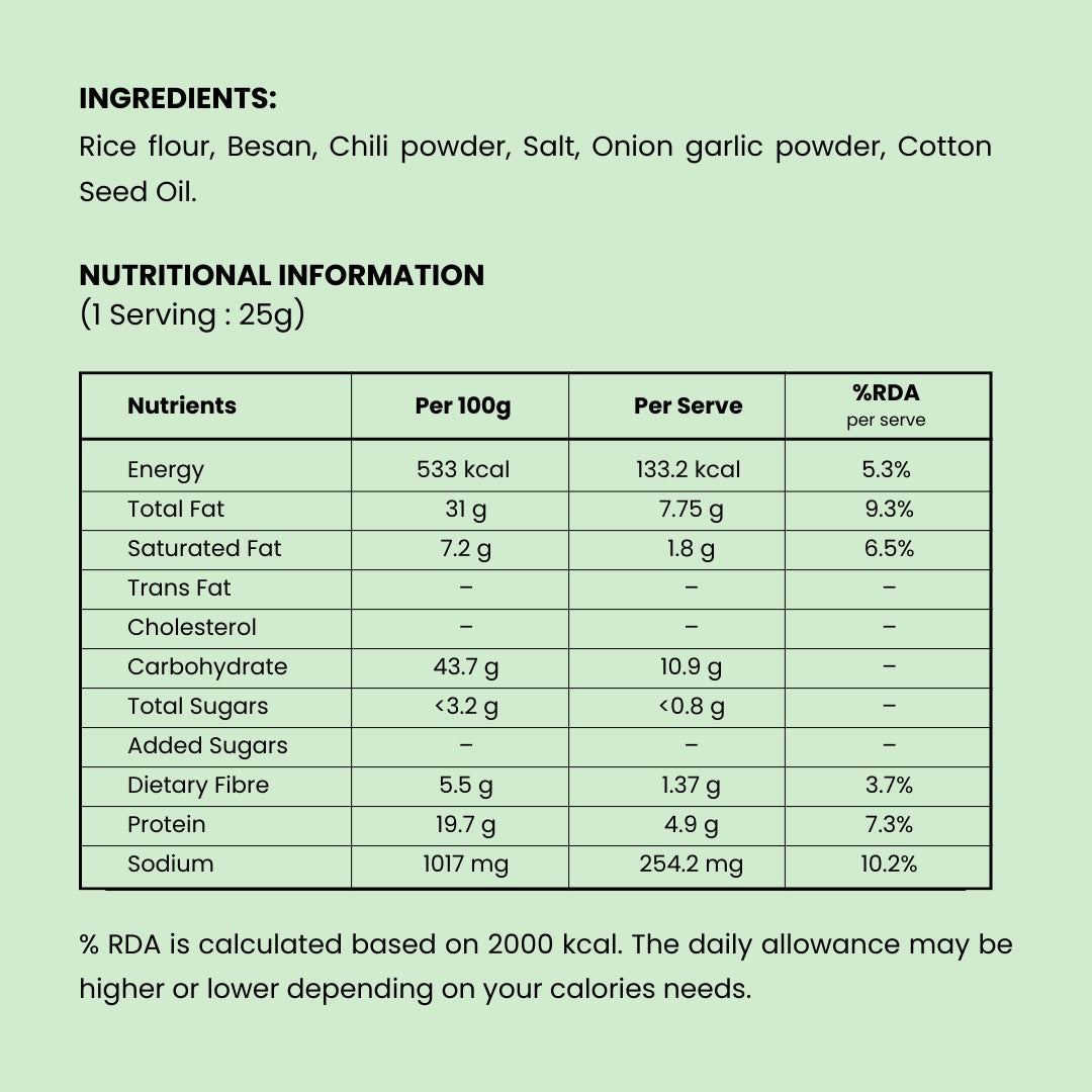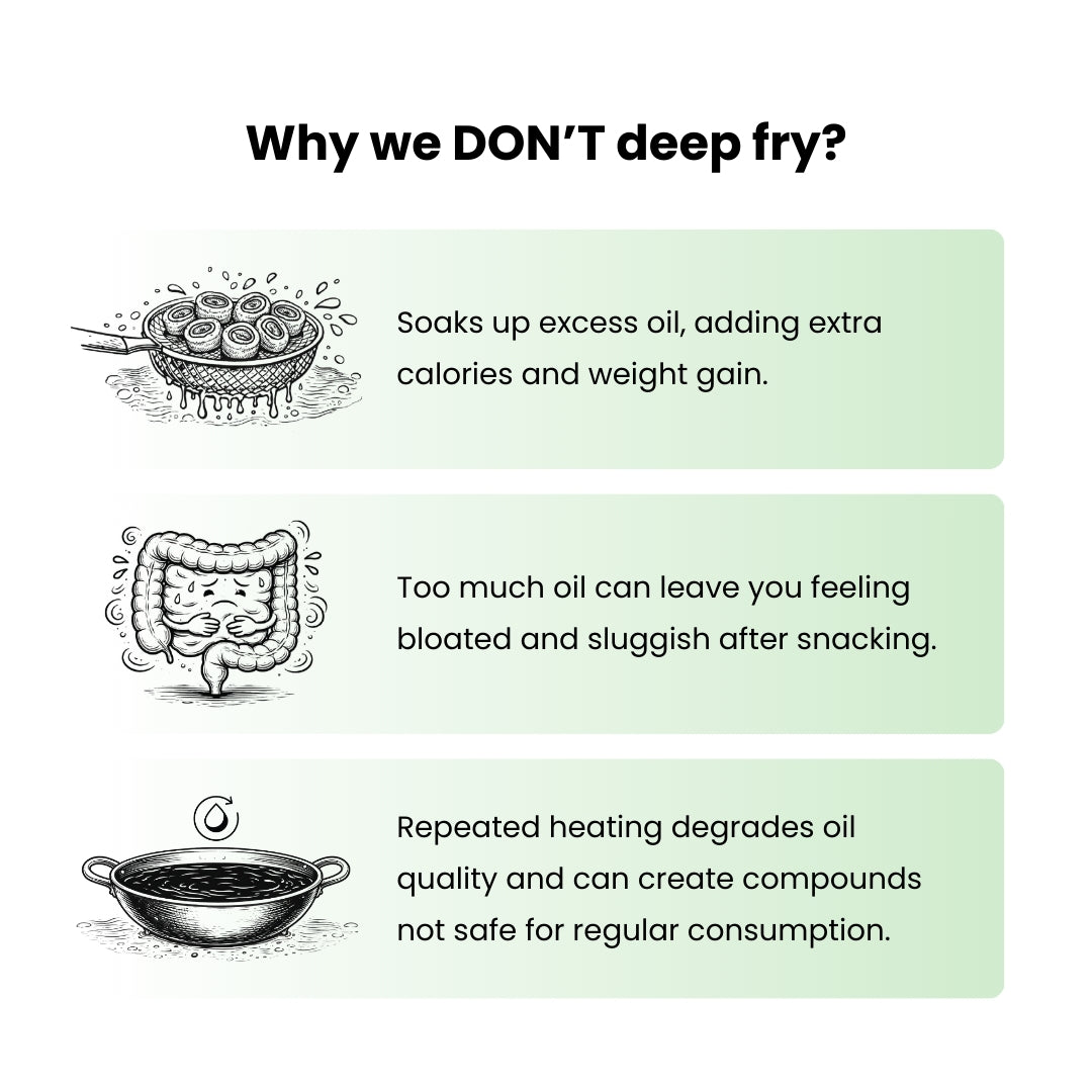 Why it's made differentlyMost namkeen brands reuse their frying oil — batch after batch. Repeated heating degrades oil quality and creates compounds that don't belong in your food. NAMKii is baked. We can't reuse oil. There's no frying vat.