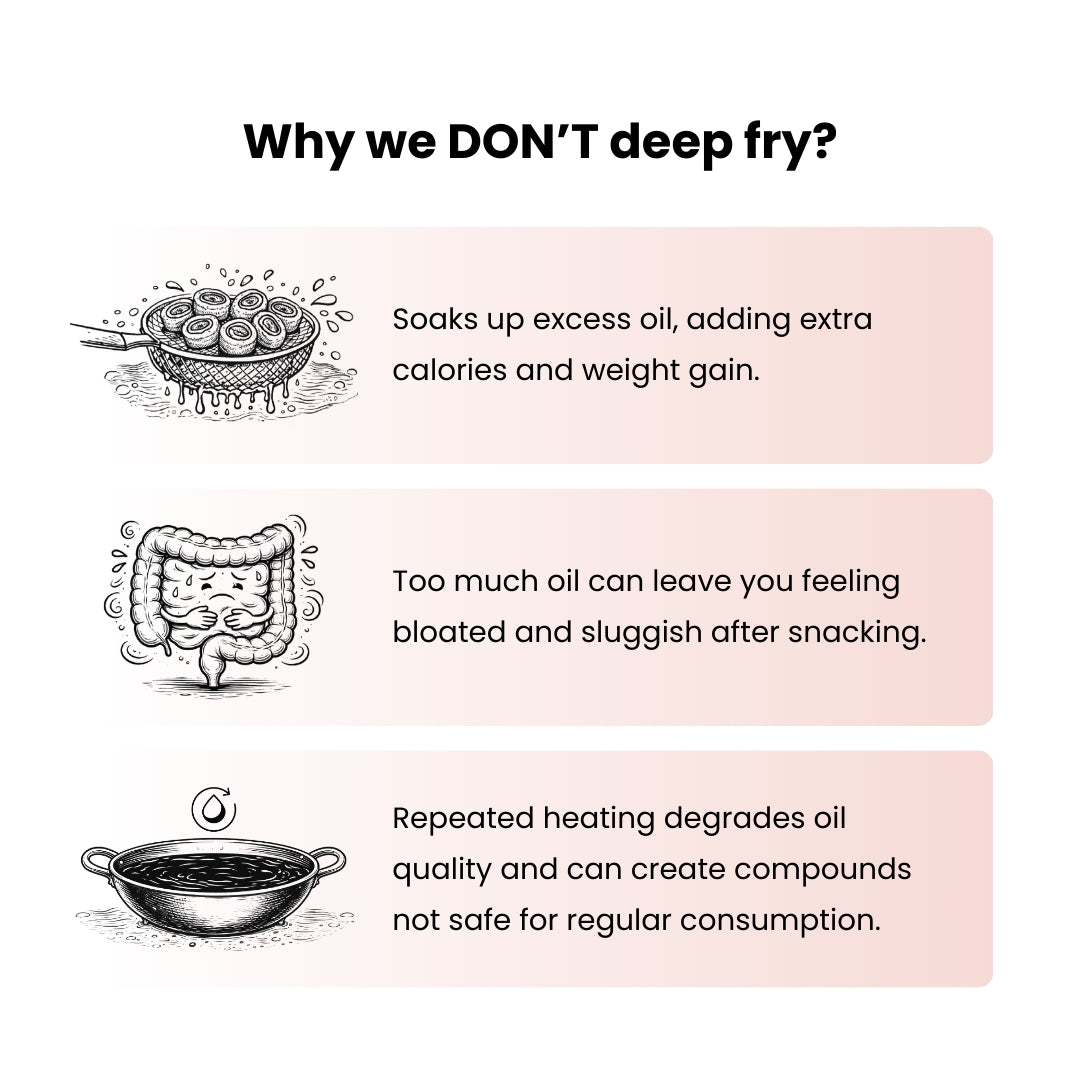Most namkeen brands reuse their frying oil — batch after batch. Repeated heating degrades oil quality and creates compounds that don't belong in your food. NAMKii is baked. We can't reuse oil. There's no frying vat. Not a policy — just how an oven works.